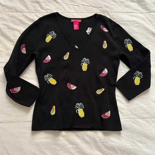 Ball of Cotton Navy blue open knit sweater with silk ruffle trim Size small -